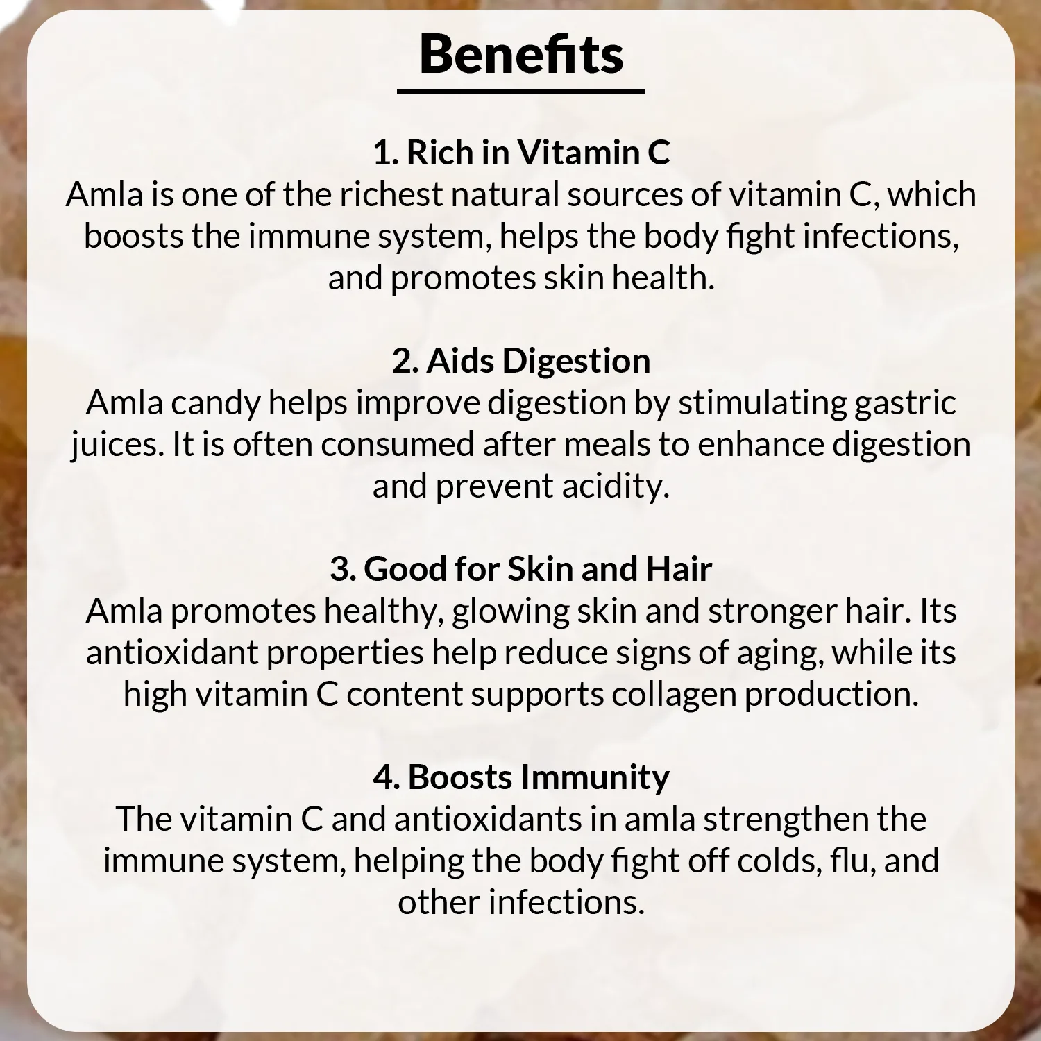 Sweet Amla Candy is rich in minerals and Vitamins such as Carotene, phosphorous, Calcium, Iron and Vitamin B Complex, hence it is a powerful anti-oxidant. It helps to boost Immunity, regulates metabolism.