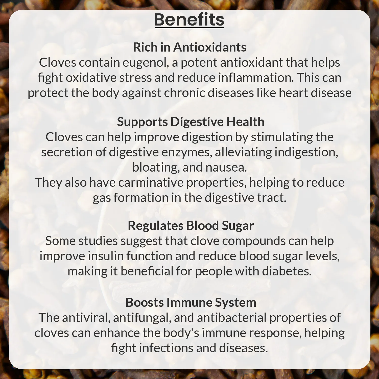 - Boosts Immunity: The antimicrobial properties of cloves support a strong immune system.
