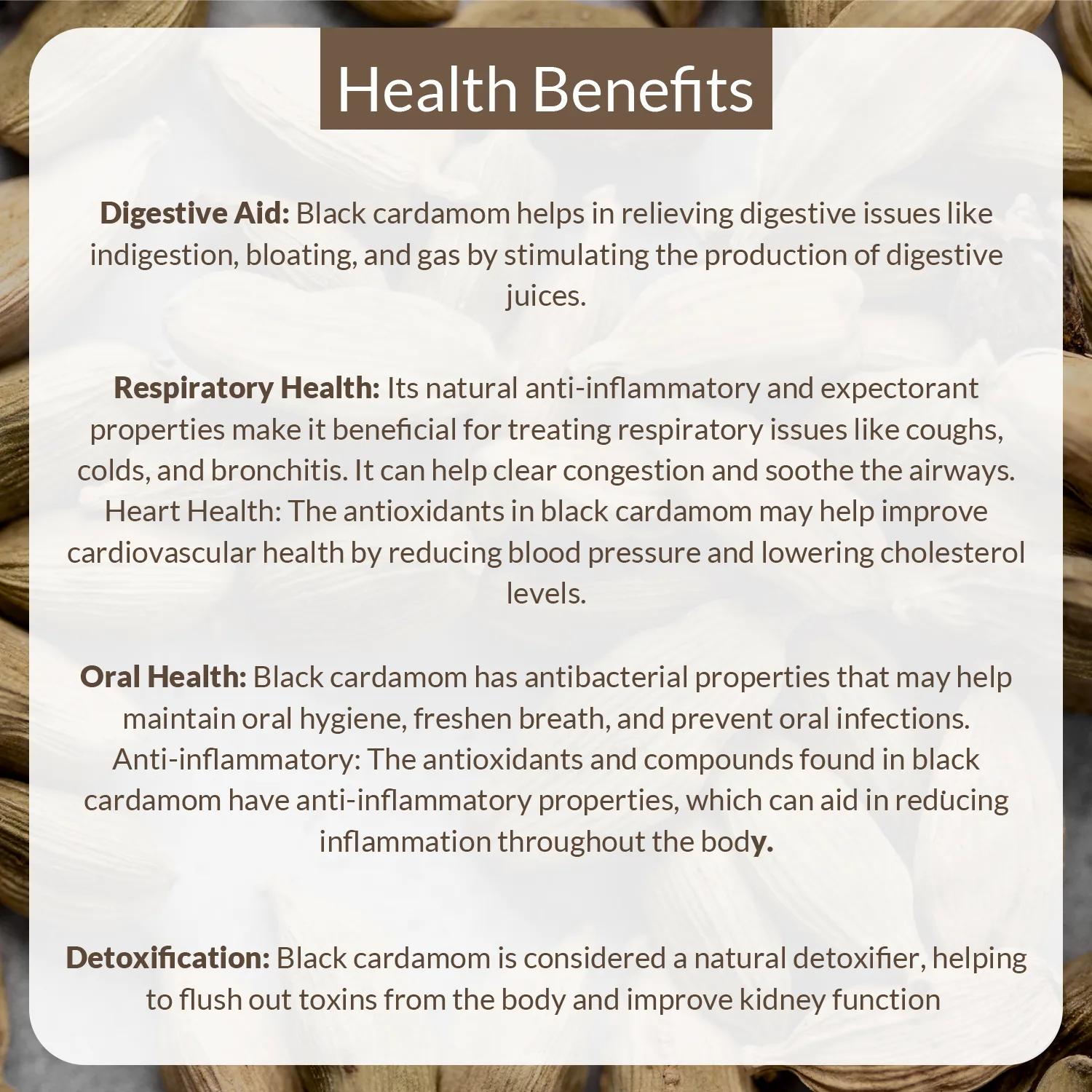 - Natural & Pure: Free from artificial additives or preservatives—just authentic black cardamom in its purest form.