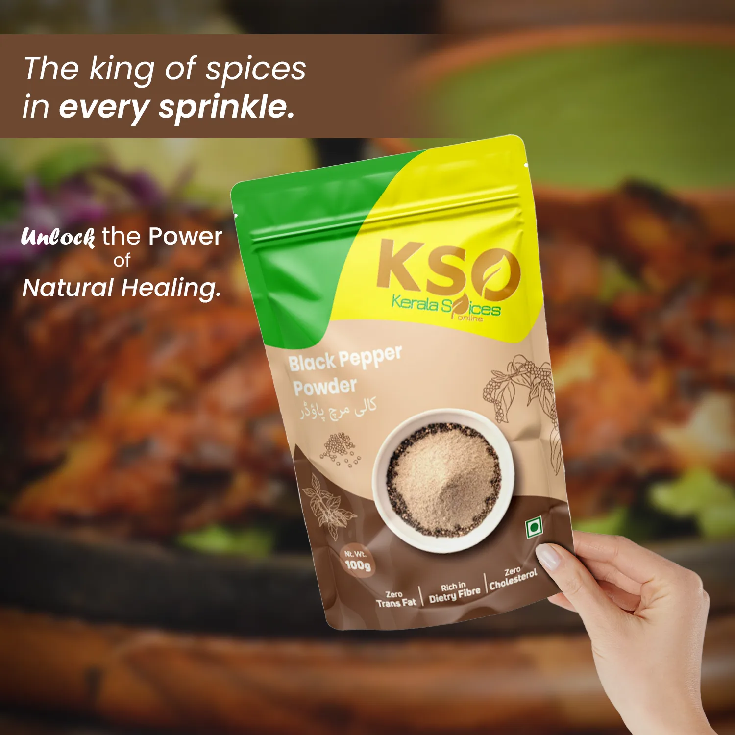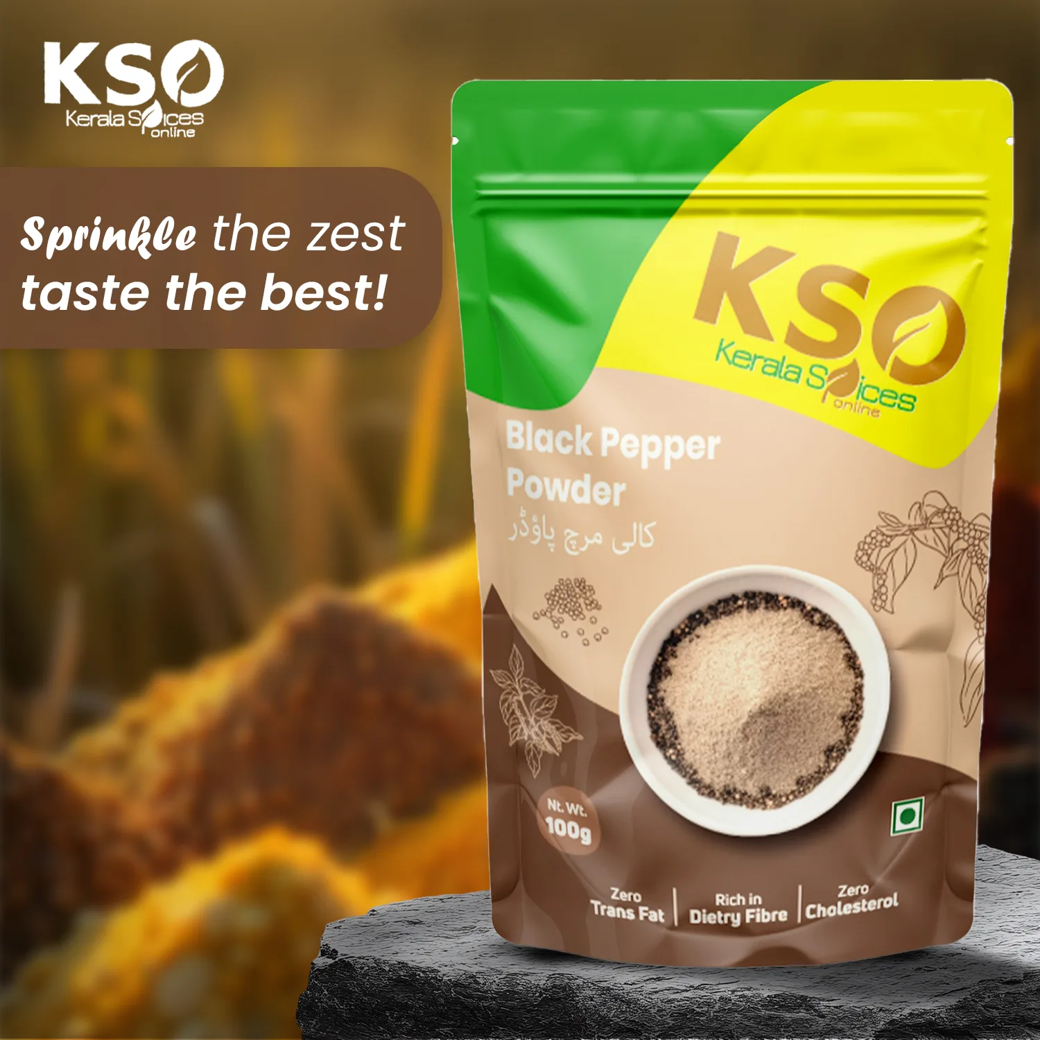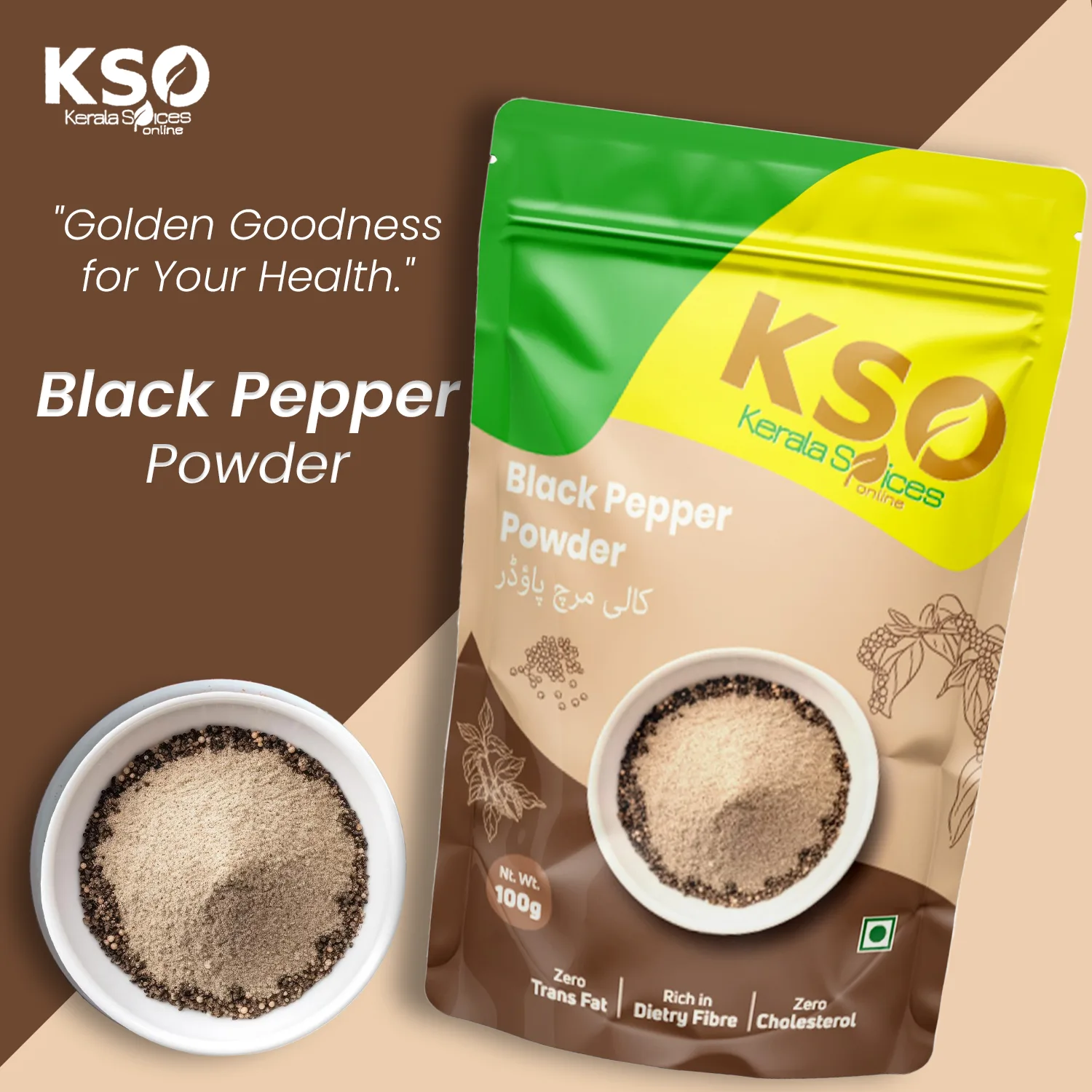 KSO’s Black Pepper Powder adds bold and fresh flavour to your food. It is made from handpicked peppercorns grown in Kerala’s natural spice farms.
