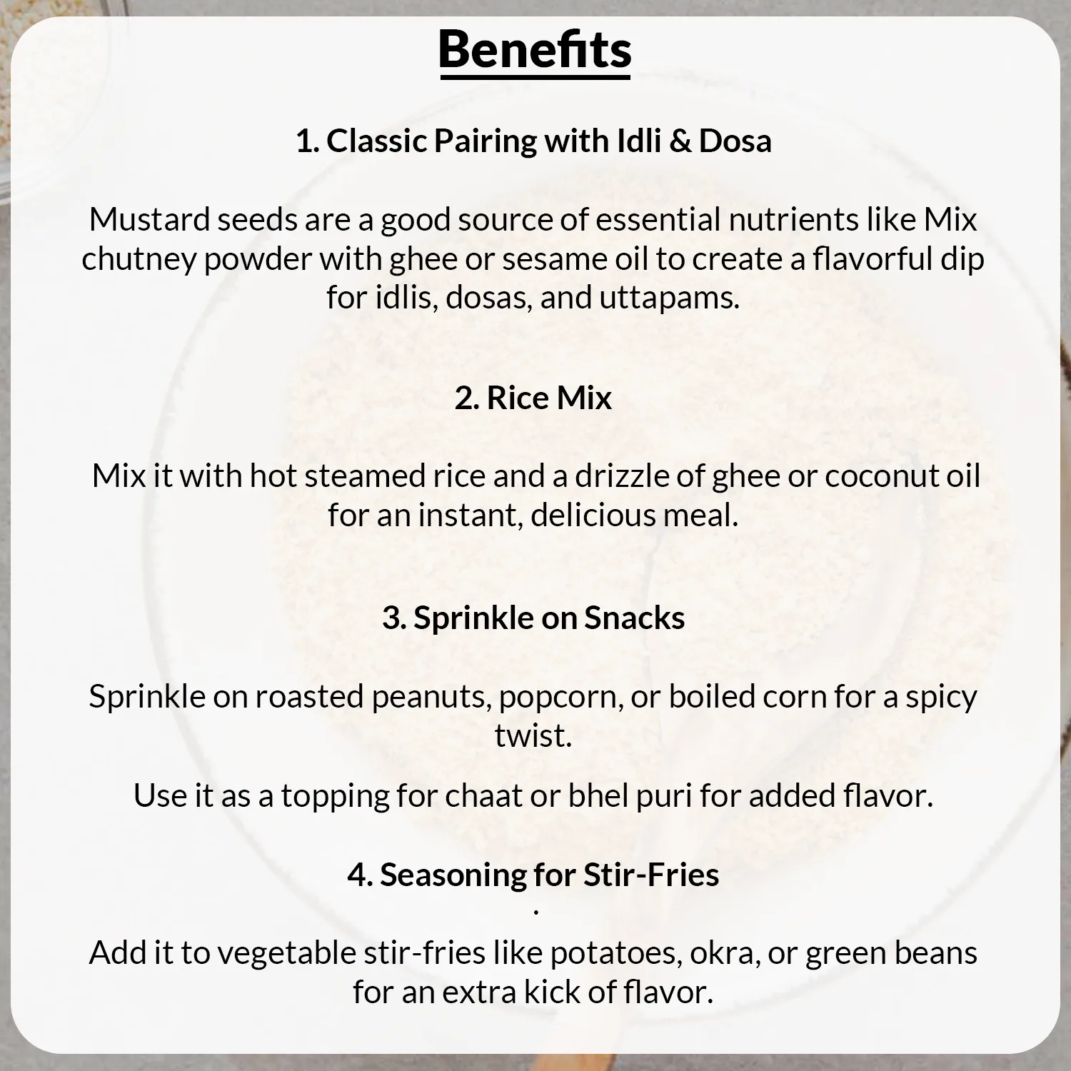 - Meal Enhancer: Sprinkle over upma, pongal or even parathas to enhance flavour instantly.