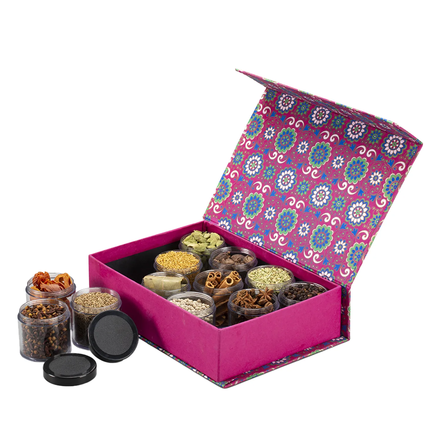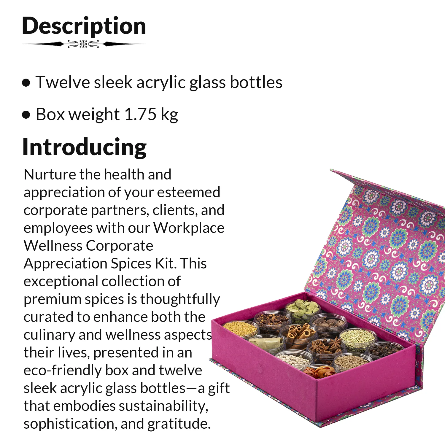 Our Spices Kit makes an excellent corporate gift box for your esteemed corporate partners, clients, and employees. This box contains a collection of premium spices thoughtfully curated to enhance the culinary and wellness aspects of their lives. It is presented in an eco-friendly rigid box and twelve sleek acrylic glass bottles—a gift that embodies sustainability, sophistication, and gratitude.