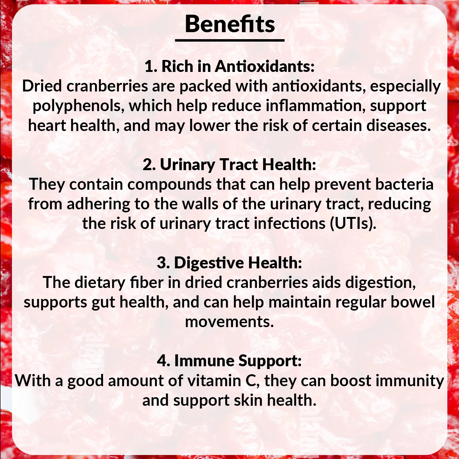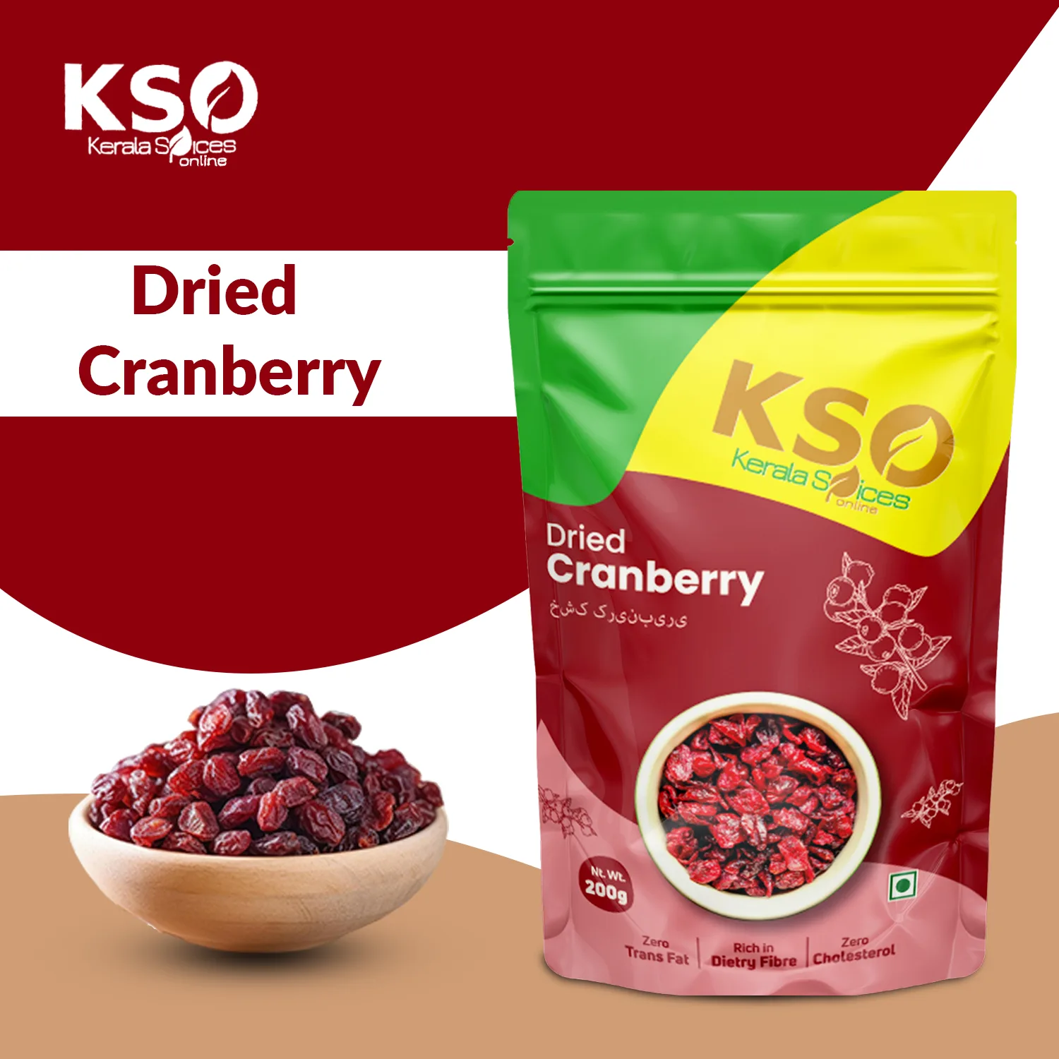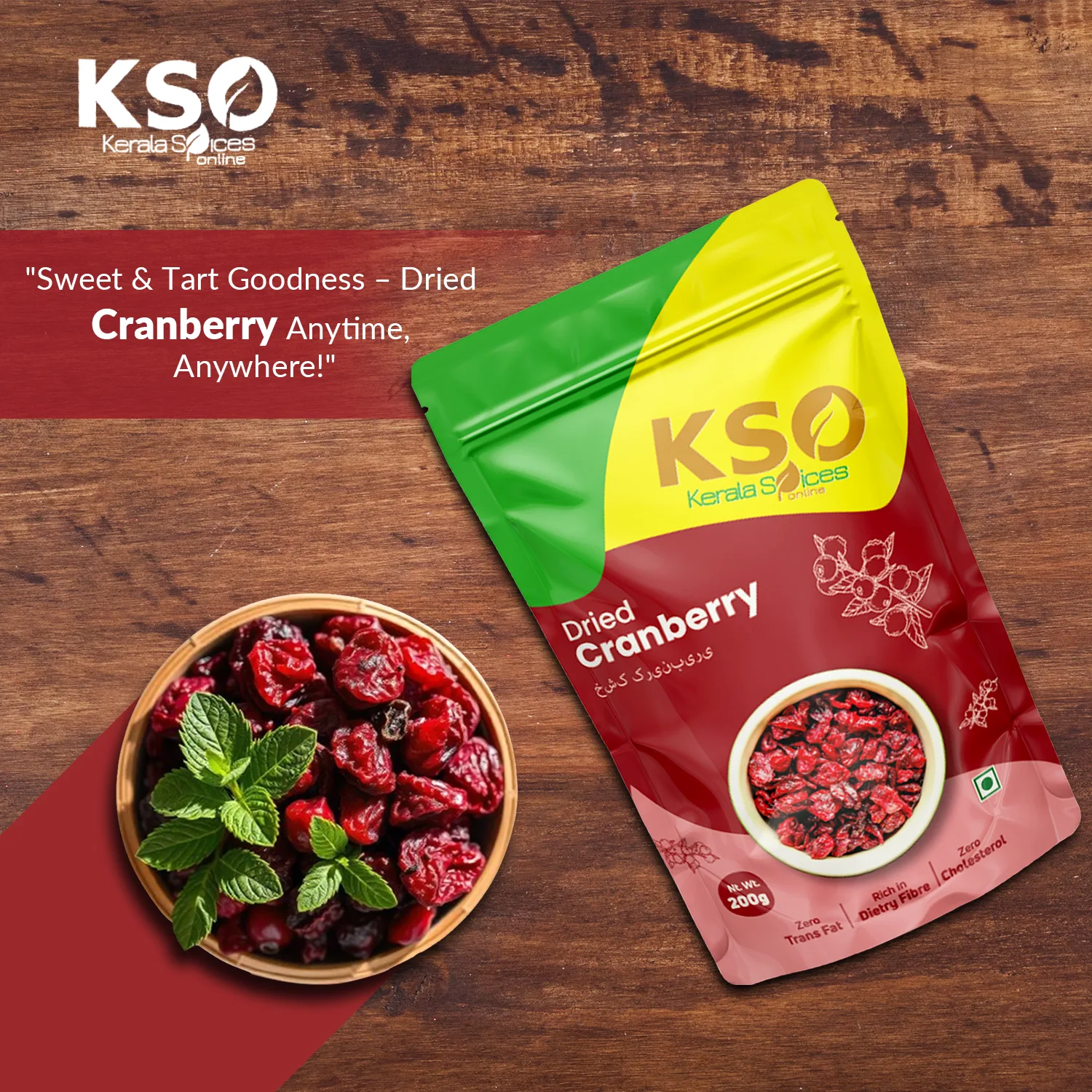Dried cranberries are high in fibre and a versatile ingredient for baking. Surprise your taste buds with the sweet, tangy and delicious taste of Dried Cranberries. The cranberries can be added to cakes, cookies, chocolate, muffins, sweet breat, cereal bars, fruit breads and muesli.