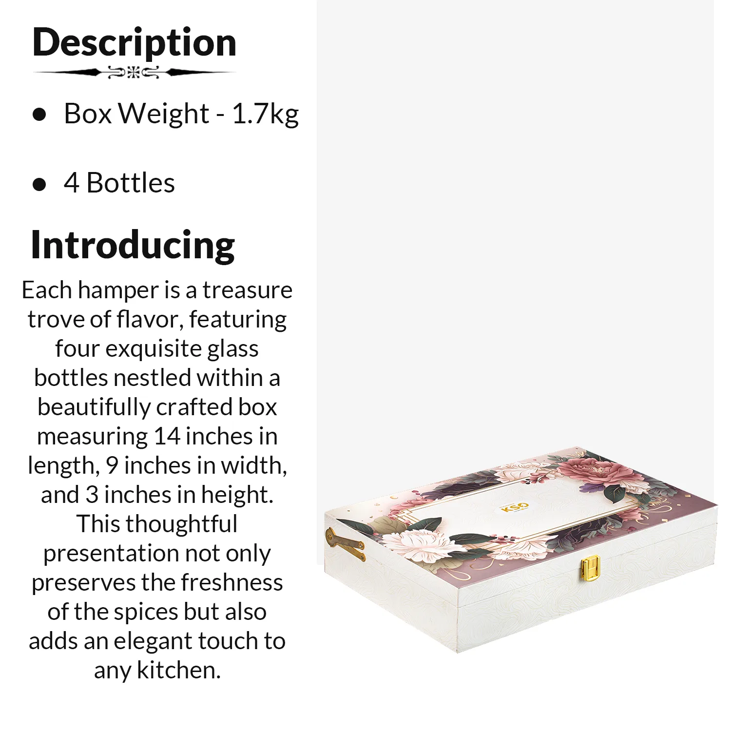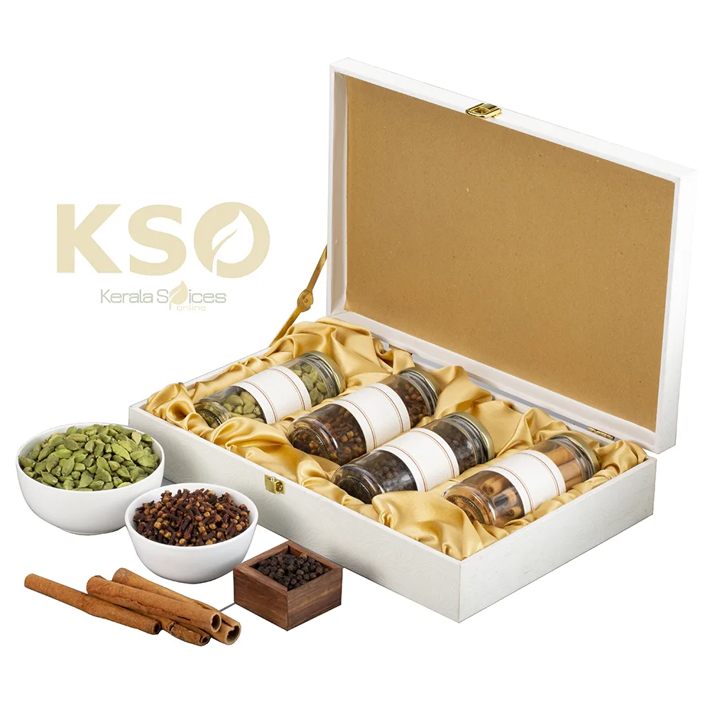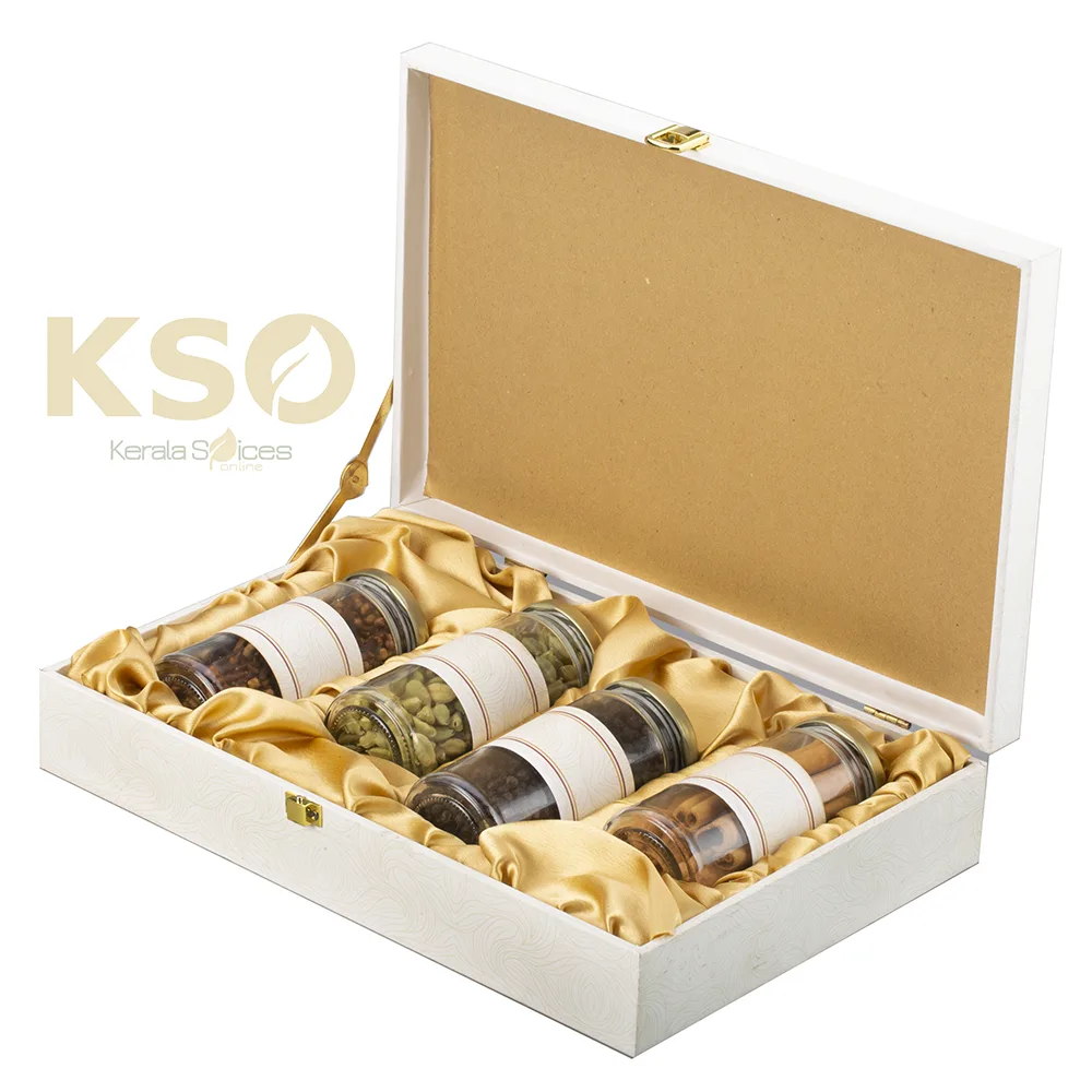 Each hamper is a treasure trove of flavor, featuring four exquisite glass bottles nestled within a beautifully crafted box measuring 14 inches in length, 9 inches in width, and 3 inches in height. This thoughtful presentation not only preserves the freshness of the spices but also adds an elegant touch to any kitchen.