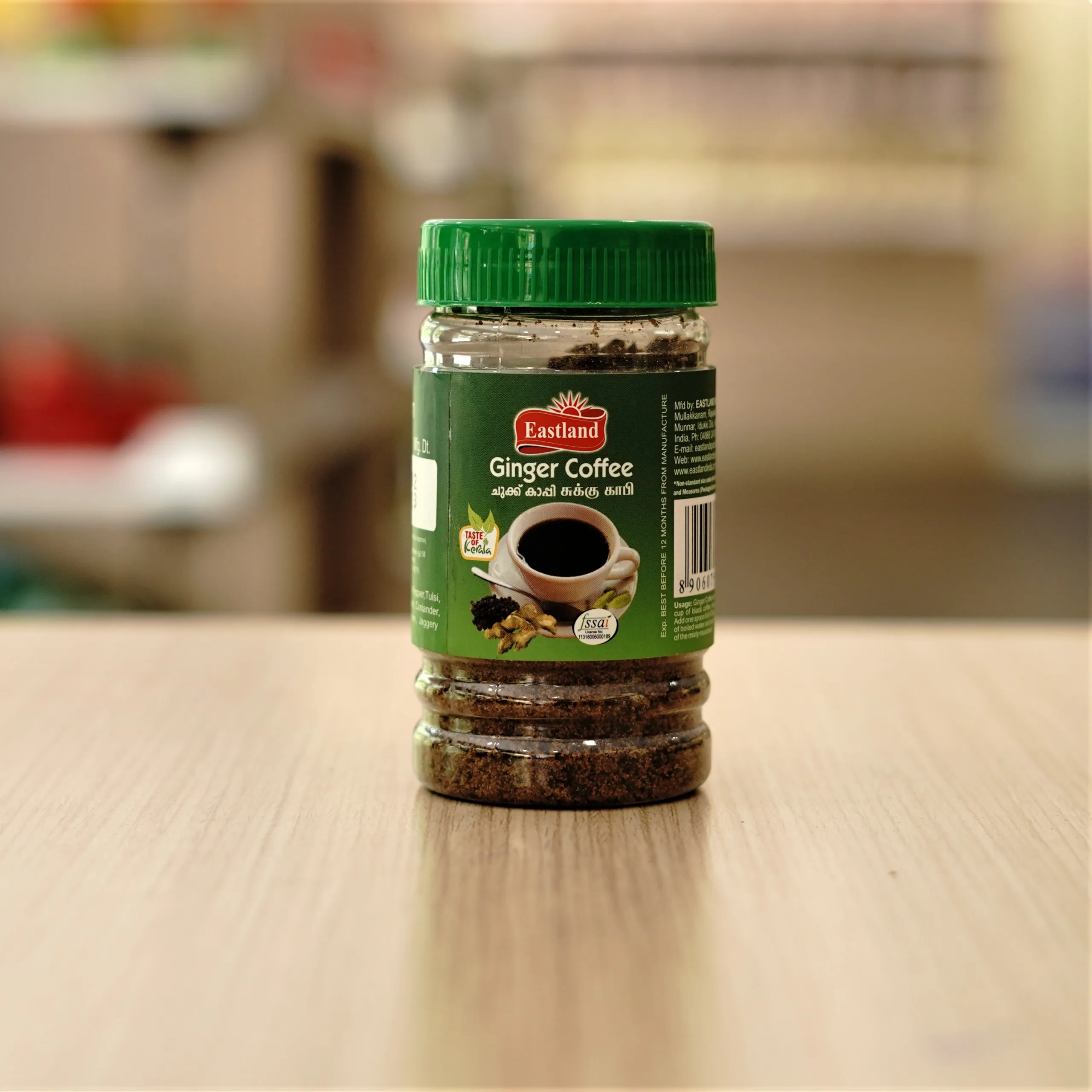 Ginger Coffee powder is used to prepare ginger coffee or chukke kappi, a popular and healthy beverage traditional to South India. This refreshing drink calms your body and mind after a long day and is a great companion during the cold winter days. As the name suggests, dry ginger is the main ingredient in this drink, combined with spices like black pepper, cumin, coriander seeds, herbs like holy basil, and palm jaggery. Ginger is known for its numerous health benefits, mainly its anti-inflammatory and antioxidant properties. Ginger is the trusted home remedy for coughs, colds, flu, fevers, and related throat irritations. Regular use of ginger powder helps in controlling blood sugar. Ginger provides effective relief for gastrointestinal problems. It lowers LDL or bad cholesterol and triglyceride levels, thus improving heart health. It also provides relief in aches and pains. Cumin seeds in ginger coffee powder help improve digestion, reduce gas problems and cramps. Coriander is effective in reducing acidity, and joint pains and soothing the digestive system. Palm jaggery, which counters the spicy taste, is high in iron content and is useful in the treatment of anaemia. This drink is very easy to prepare and is an excellent home remedy.