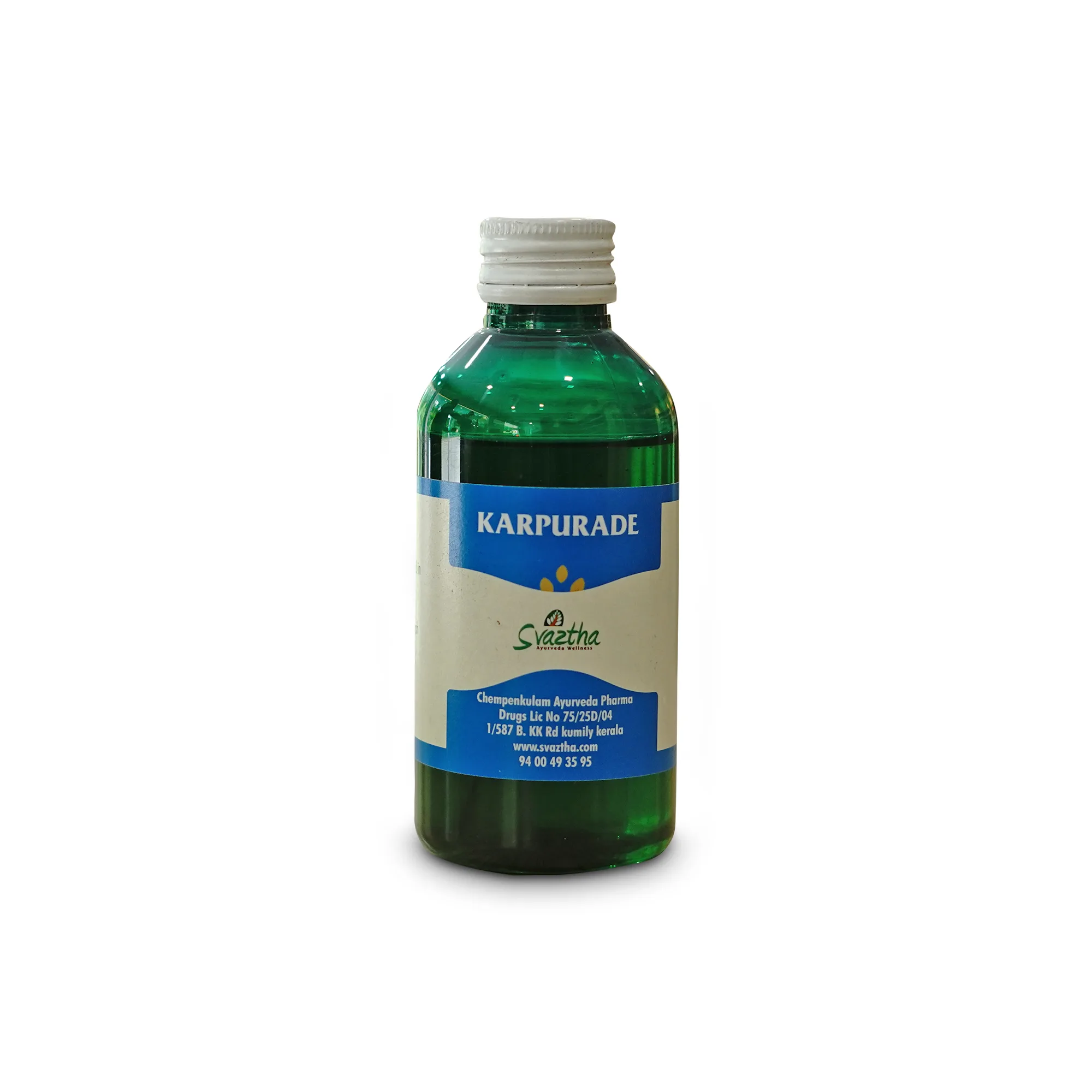 Karpurade oil is an ayurvedic herbal oil prepared in sesame oil or coconut oil base.It is used in mascular pain,rheumatic complaints,muscle cramp etc.This oil is based on Kerala Ayurveda principles.It is also known as karpurde thailam.