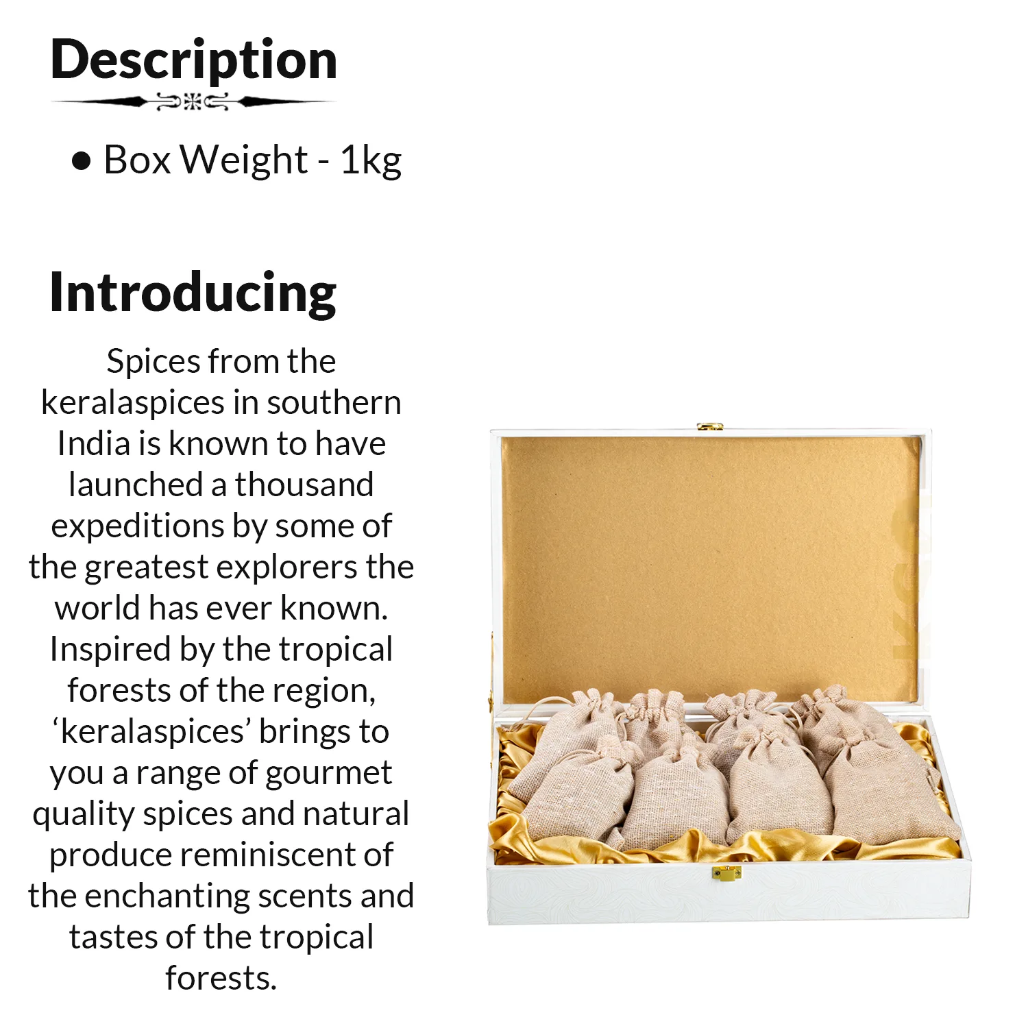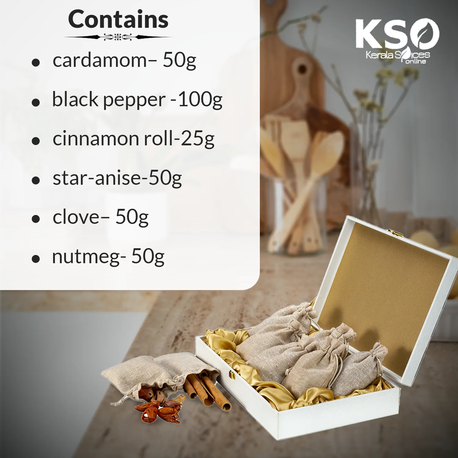 Gift pack contains: Black Pepper – 100g | Cardamom – 100g | Cloves – 100g | Staranise-50g | Cinnamon -25g | |Nutmeg- 100g | nutmace 25gm