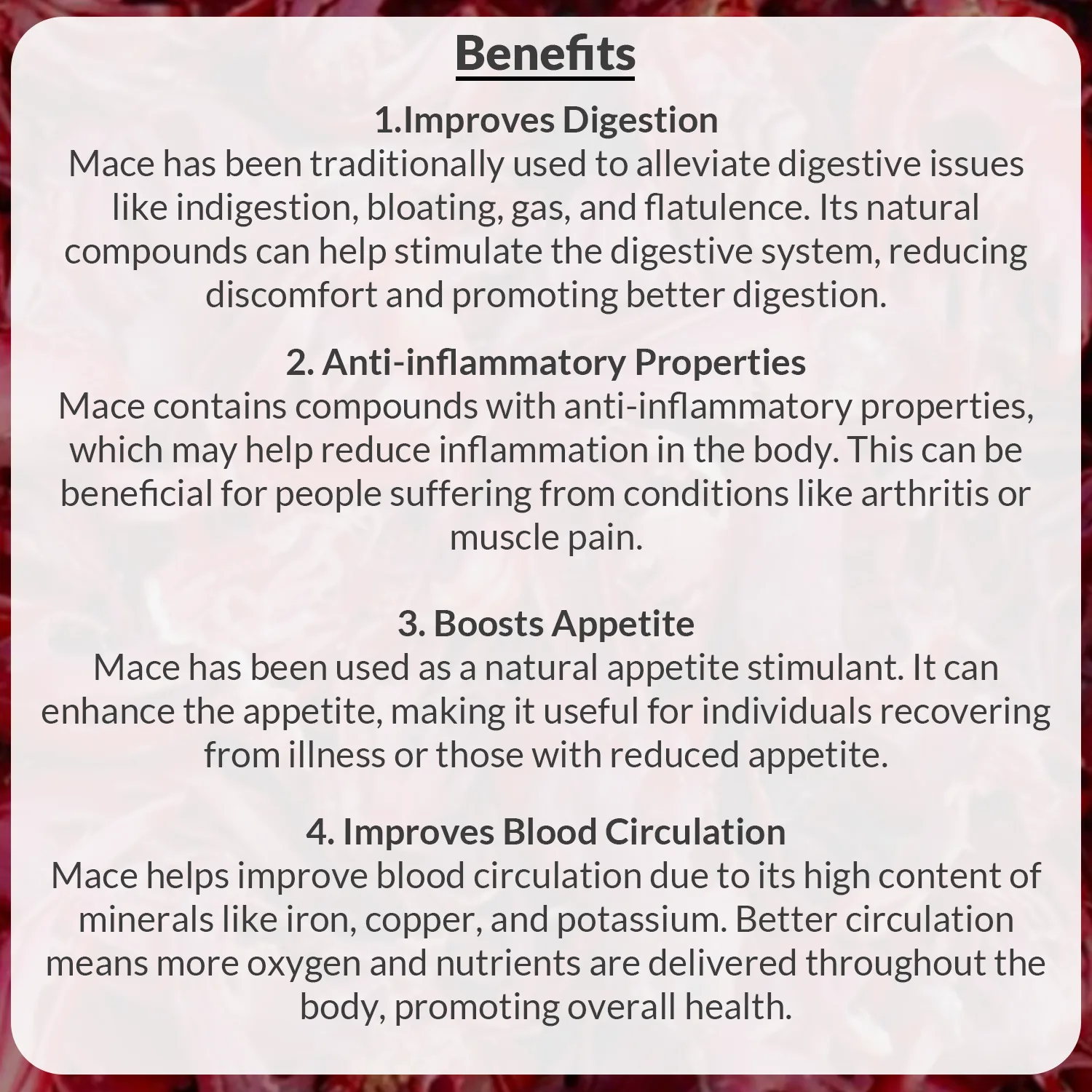 Nut mace is a aromatic condiment that is reddish in colour and resembles a dried flower, mace is what covers the shell of nutmeg.