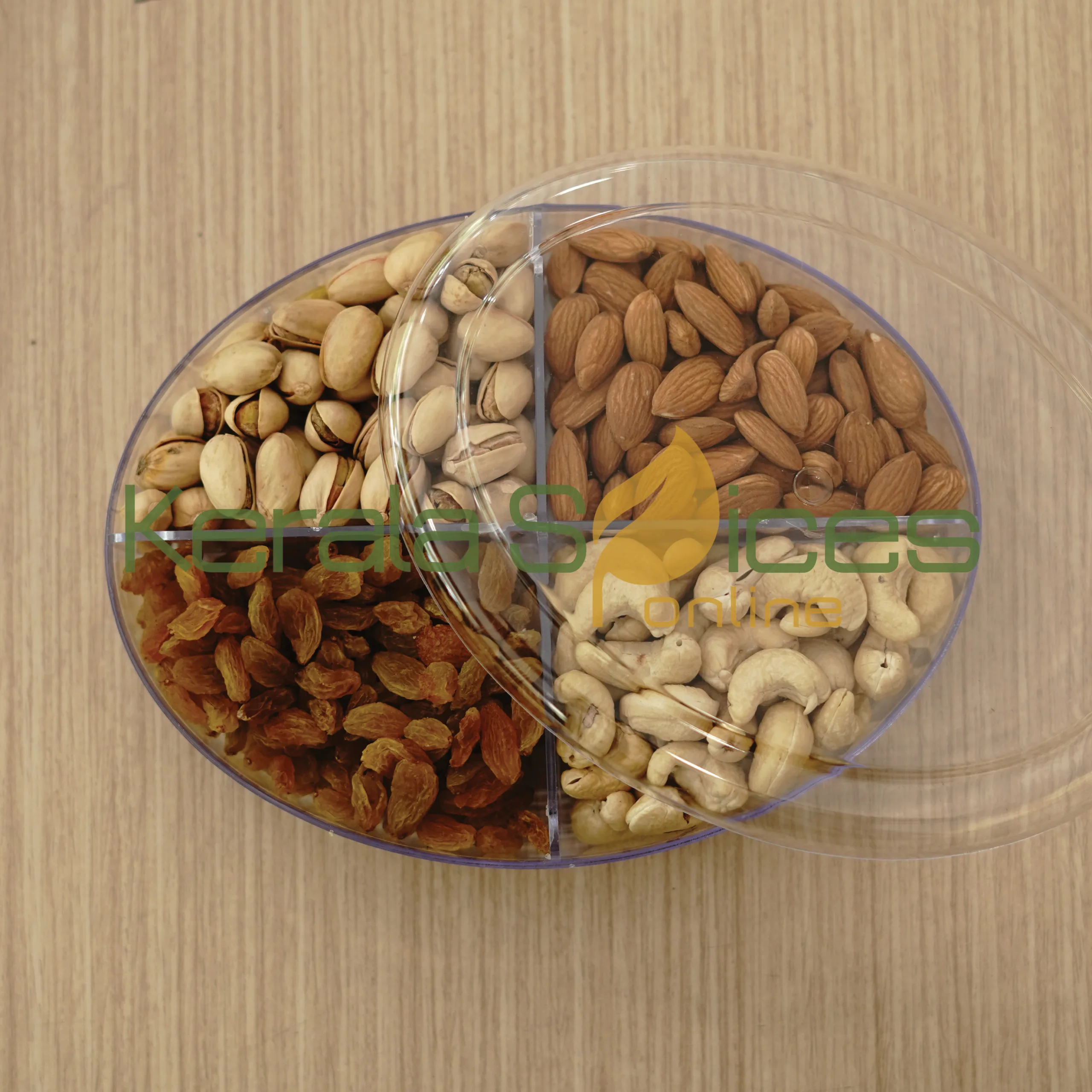 This gift box contains 150gms approx each of Premium quality Cashew w240, Almond Grade 1, golden kismis, and pista . This can be gifted for any occasion like weddings, Deepavali, birthdays, etc..
