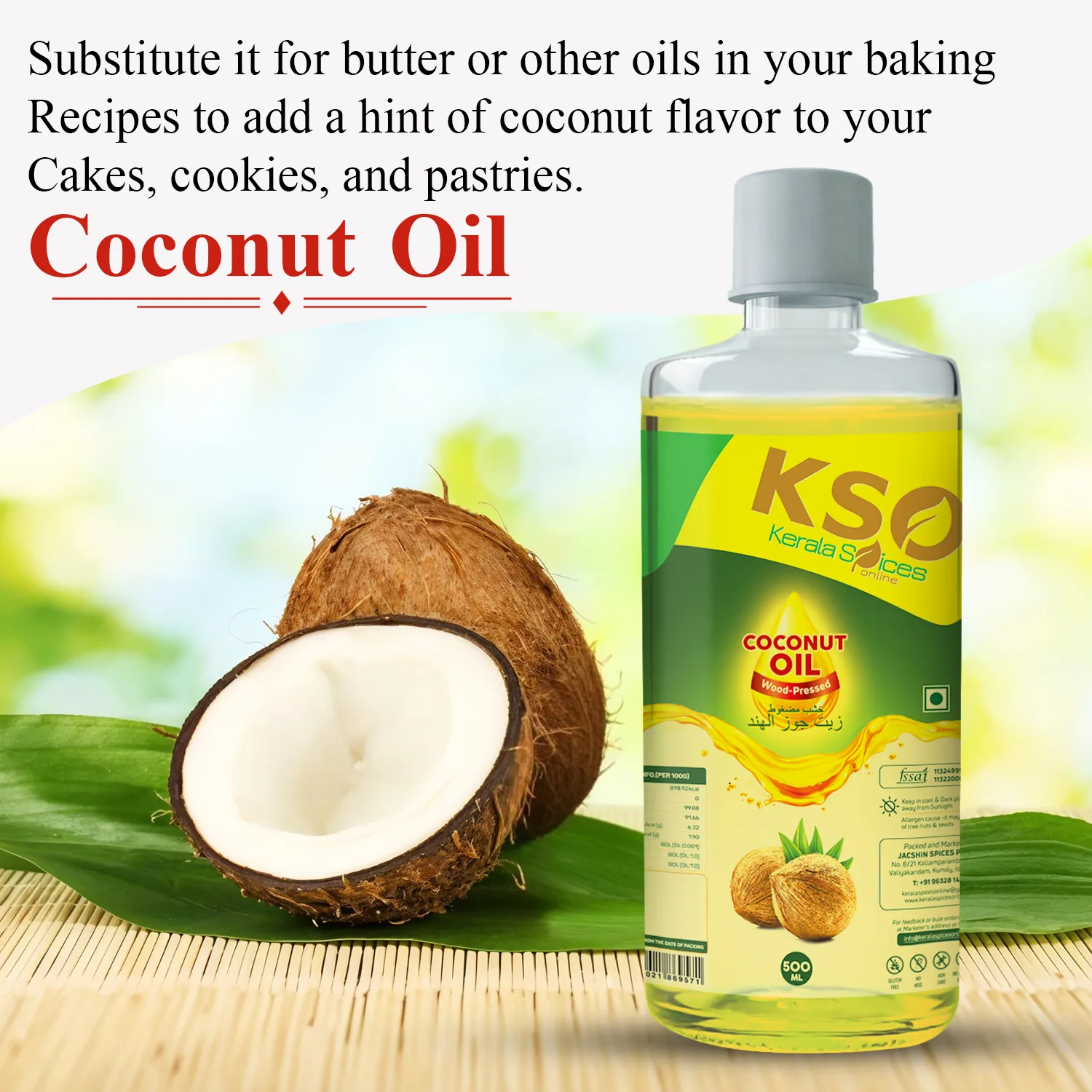This oil is 100 per cent pure and traditionally made from the finest quality coconuts. Most coconuts are collected from certified organic farms across Kerala.