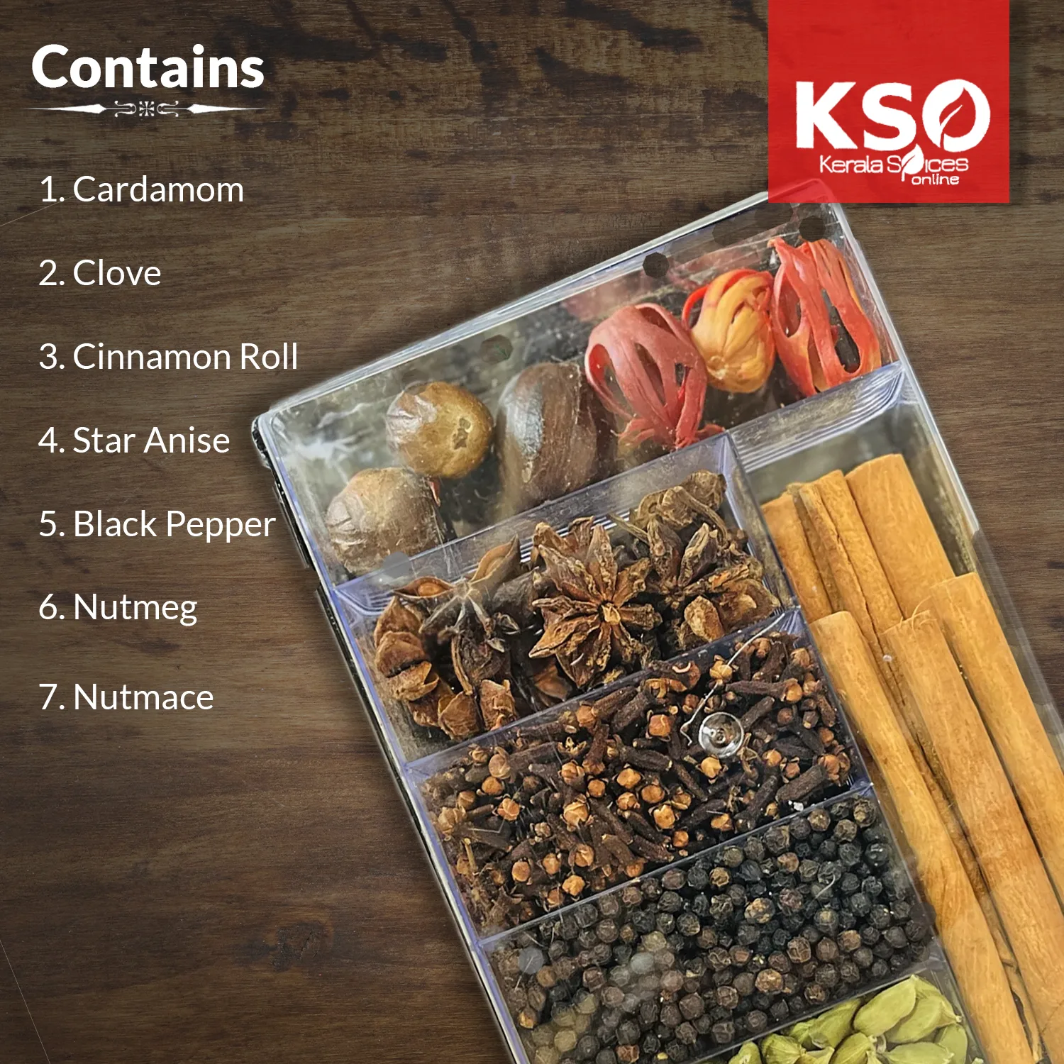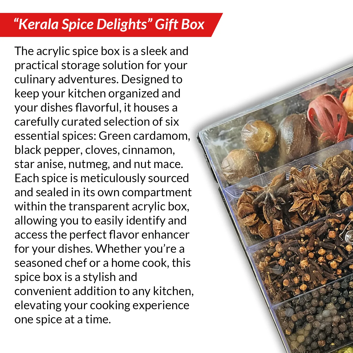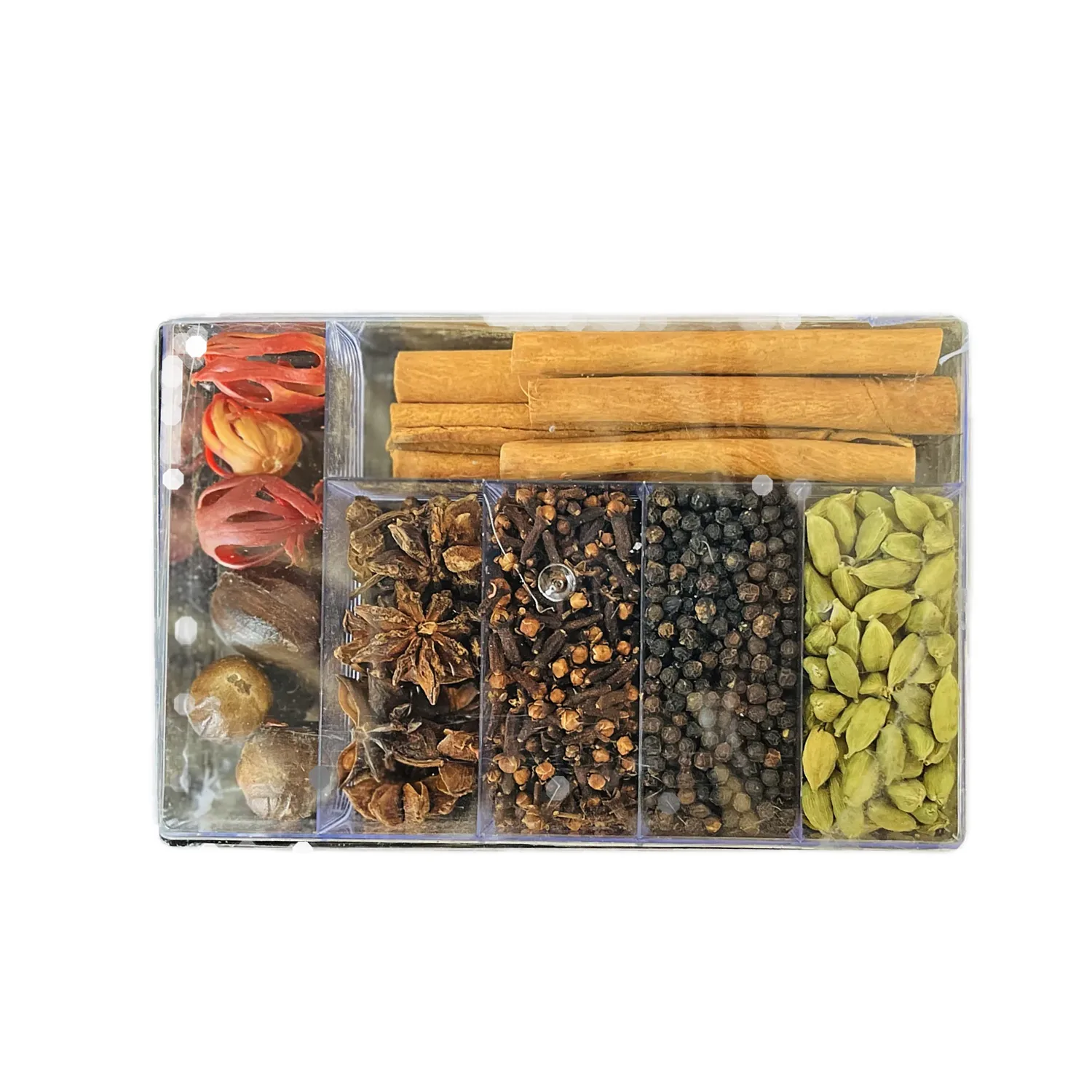 The acrylic spice box is a sleek and practical storage solution for your culinary adventures. Designed to keep your kitchen organized and your dishes flavorful, it houses a carefully curated selection of six essential spices: Green cardamom, black pepper, cloves, cinnamon, star anise, nutmeg, and nut mace. Each spice is meticulously sourced and sealed in its own compartment within the transparent acrylic box, allowing you to easily identify and access the perfect flavor enhancer for your dishes. Whether you’re a seasoned chef or a home cook, this spice box is a stylish and convenient addition to any kitchen, elevating your cooking experience one spice at a time.
