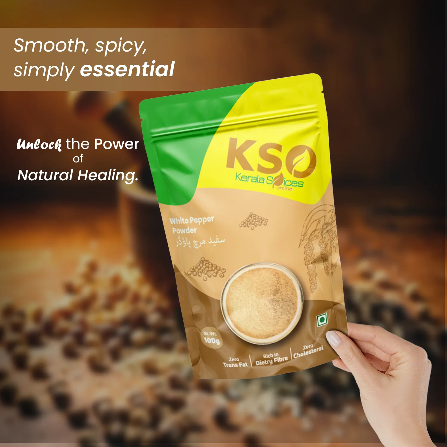 Choose quality you can trust. KSO White Pepper Powder is made from 100% pure and naturally sourced pepper from Kerala with authentic flavor and zero additives. We ensure each batch is cleaned, processed, and tightly packed to keep the spice at its aromatic best. Available in multiple pack sizes, it is the perfect addition to every kitchen.