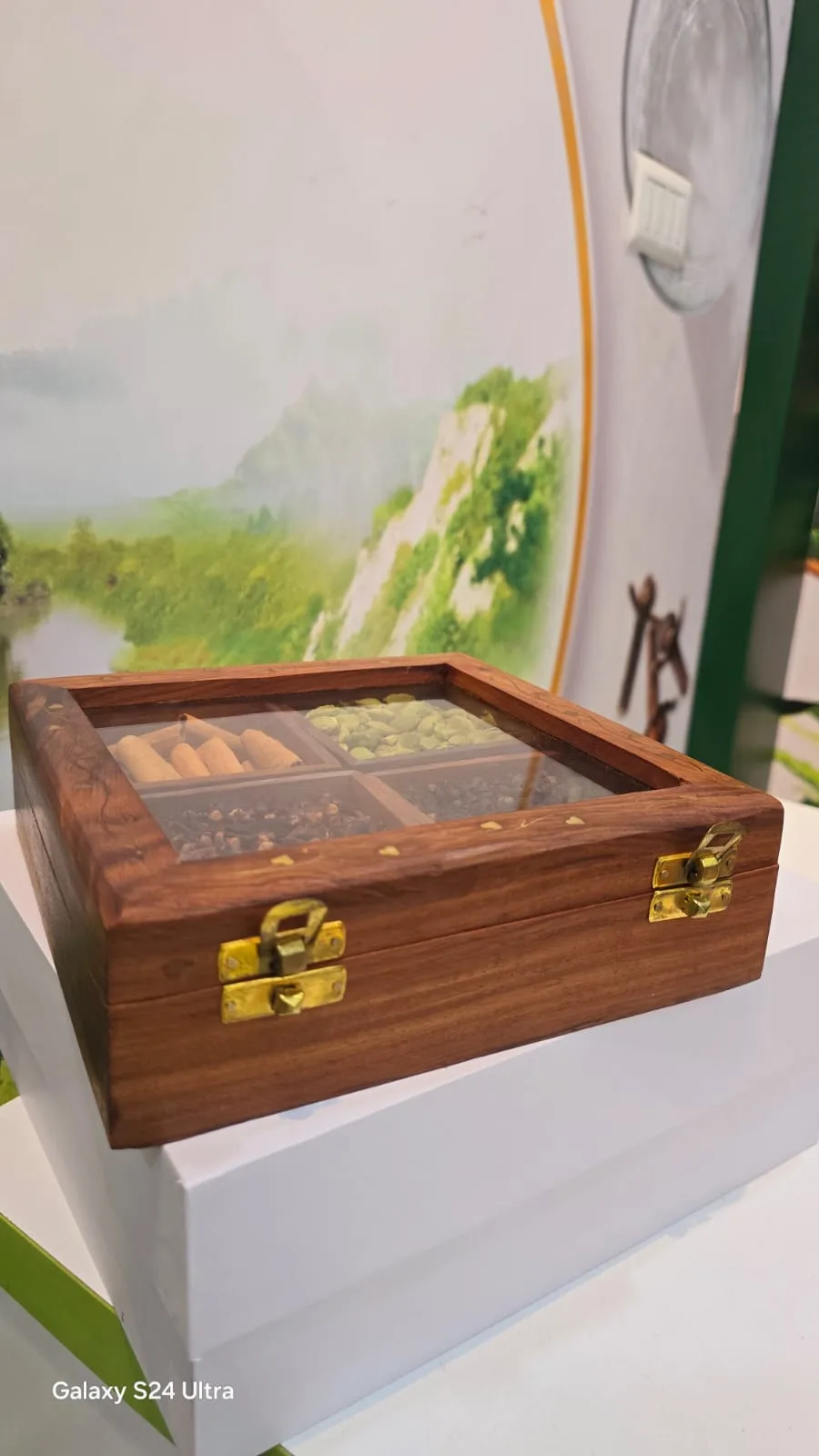 This box is a premium wooden spice gift box containing four authentic Kerala spices: green cardamom, Black pepper, cloves, and Cinnamon. All these spices are carefully selected and handpicked. This box is user-friendly and can be used for an extended period in your kitchen. Even if the spices are used up, they can be purchased and replenished. The Wooden spice box will be an asset in your Kitchen